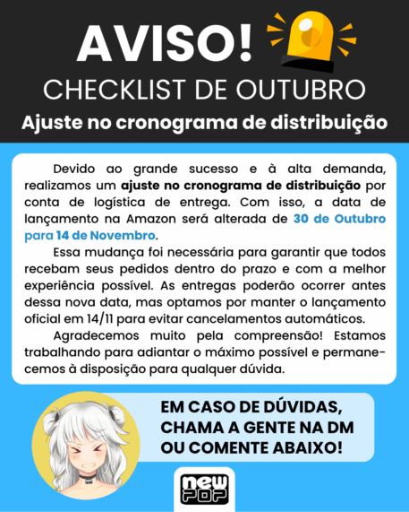 Essa mudança foi necessária para garantir que todos recebam seus pedidos dentro do prazo e com a melhor experiência possível. As entregas poderão ocorrer antes dessa nova data, mas optamos por manter o lançamento oficial em 14/11, para evitar cancelamentos automáticos.